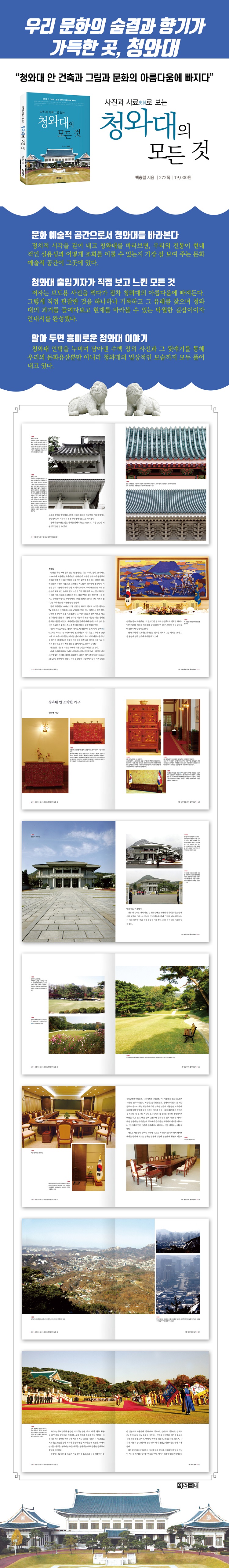 이 책은 청와대를 출입하면서 기록한 사진과 글을 담고 있다. 청와대 출입기자가 된 후 보도용 사진을 찍다가 점점 청와대 안 건물, 그림, 가구, 풍경의 아름다움에 마음을 빼앗겼다. 지붕에 왜 청기와를 올렸을까? 지붕 위의 괴상한 형상은 무엇을 뜻할까? 건물 안에 걸린 그림들은 누가 그렸을까? 청와대 구석구석이 어떤 의미를 갖고 있을까? 모든 것이 너무도 궁금했다.