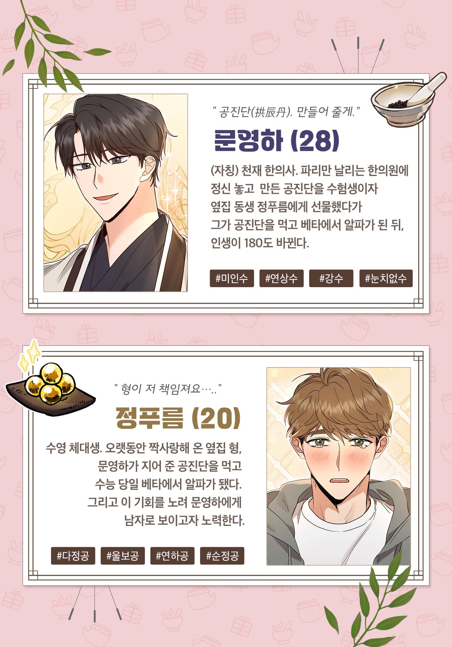 원장이 오메가라는 이유로 파리만 날리는 한의원을 부흥시키고자 하는 문영하와 그런 문영하를 10년 넘게 짝사랑해 온 옆집 체대생 정푸름.