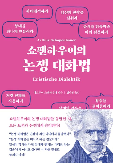 ‘쇼펜하우어식 논쟁 대화법’은 한마디로 수단과 방법을 가리지 않고 논쟁에서 이기는 말싸움 기술이다. 대철학자의 조언치고는 너무 노골적이고 천박하지 않냐고? 천만의 말씀! 두 가지 이유에서 그렇다. 첫째, 어떤 주장이 ‘진리의 편에 서 있는가?’와 그 주장이 ‘논쟁 상대, 논쟁을 듣는 청중 모두의 동의를 얻어 진리의 편에 선 것처럼 보이는가’는 전혀 별개의 문제인데, 현실의 모든 논쟁은 후자의 문제이기 때문이다. 둘째, 쇼펜하우어에 따르면 논쟁 대화법은 인간이라는 생물 종이 지닌 태생적 ‘악의’에서 비롯되었기 때문이다. 그러하기에 순수하다 못해 순진하기 짝이 없는 태도로 토론과 논쟁에 참여하는 것은 전쟁터에 총 대신 꽃이나 십자가를 들고 나가는 것과 다를 바 없다. 그런 면에서 이 책은 정신이 번쩍 나게 할 만큼 현실적이고, 지독하리만큼 냉혹하며, 혀를 내두르게 할 만큼 전략적이다.