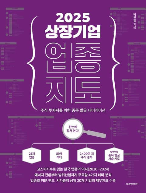 1부는 주가지수를 통해 한국 주식시장의 역사를 훑어본다. 2000년부터 2024년까지 코스피지수가 상승한 시기에 주목받은 업종을 살펴보며 금리와 유가, 경제 성장률도 분석했다. 2부에서는 주목해야 할 4가지 테마로 ‘에너지, 바이오, 뷰티, 방위산업’을 선정하고 관련 기업들을 소개하며 투자 포인트를 짚어준다. 3부에서는 상장기업을 25개 업종으로 분류하고 업종별 특성과 이슈, 주요 기업을 설명한다. 업종마다 시가총액 상위 20개 종목에 대해선 시가총액, 자본총계, 매출액, 순이익, 차입금 비율 등 핵심 재무 데이터를 수록했다. 투자자에게 실질적인 도움이 될 지표인 PBR 밴드도 추가했다. 25개 업종과 지주사의 업종 지도는 시인성과 가독성을 높인 플로 다이어그램 형식이어서 업종부터 기업까지 공급사슬을 쉽게 파악할 수 있다.