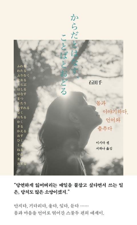 뎃켄헤테로토피아 문학상을 수상하고 여러 차례 아쿠타가와상 후보에 오른 소설가이자 에세이스트 이시다 센. 그녀의 작품을 1984BOOKS에서 국내에 처음 소개한다. 이시다 센은 어딘지 고풍스러우면서 차분한 일본어를 사용해 편안한 문체로 글을 쓰는 것으로 좋은 평가를 받아온 작가다. 이 책 『몸과 이야기하다, 언어와 춤추다』는 그러한 이시다 센이 몸과 마음이 내는 목소리에 귀 기울여 언어로 엮은 에세이집이다. 만지다, 노래하다, 울다, 잊다, 자르다, 달리다, 쓰다 등 스물두 개의 동사로 엮어가는 문장은 몸과 마음과 온전히 마주하면서 가끔은 뿔뿔이 흩어져 사라질 듯한 그 둘을 언어를 매개체로 단단히 이어두려고 하는 자그마하지만 과감한 행위다. 일상의 작은 순간을 그녀만의 시선으로 세심하게 들여다보고 몸과 마음이 발하는 움직임을 언어화해 섬세하게 묘사하는 작가의 이야기를 읽다 보면 평범한 일상도 어딘지 아련한 비일상이 되면서 오감이 날카로워진다. “말은 몸과 묶이면 넘어지고 마음과 묶이면 엉킨다.”고 말하는 이시다 센의 에세이를 통해 작지만 소중한 날들의 순간을 잃어버리지 않고 곁에 두려고 한 작가의 수많은 움직임과 감정을 생생하게 느끼며 우리의 몸과 마음까지도 그 언어를 통해 들여다보게 된다.