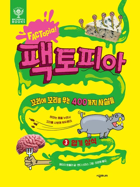 팩토피아 세 번째 주제: 엽기 상식 더럽고 지저분해서 웃긴 지식을 담은 괴이한 팩트의 세계 “블루치즈는 착한 곰팡이로 만들어. 런던의 어느 박물관에서는 유명 인사들의 겨드랑이에서 채취한 세균으로 만든 치즈를 전시해. 어떤 과학자들은 풍선껌 맛이 나는 치즈를 개발했어. 미국 워싱턴주에는 껌벽이라는 유명한 관광지가 있어. 어떤 미국 여성이 코로 축구공보다 큰 풍선껌을 불었다고 해.” 일상에서 만나기 힘든 이 엉뚱하고 괴상스러운 상식은 머릿속으로 떠올리며 읽는 것만으로도 호기심이 커진다. 『팩토피아 ③ 엽기 상식』은 똥오줌, 방귀, 트림, 냄새처럼 더럽고 지저분한 이야기나 벌레나 이 등 작은 생물들의 엽기적인 사실 400가지를 한데 모았다. 모든 사실은 점선으로 연결되어 있으며, 여러 방법으로 책을 즐길 수 있도록 샛길도 마련해 놓았다. 더럽고 지저분하지만 왠지 자꾸만 읽고 싶어지는 엽기 팩트들! 아이들의 호기심을 단번에 끌며 독서의 재미를 발견하게 한다.