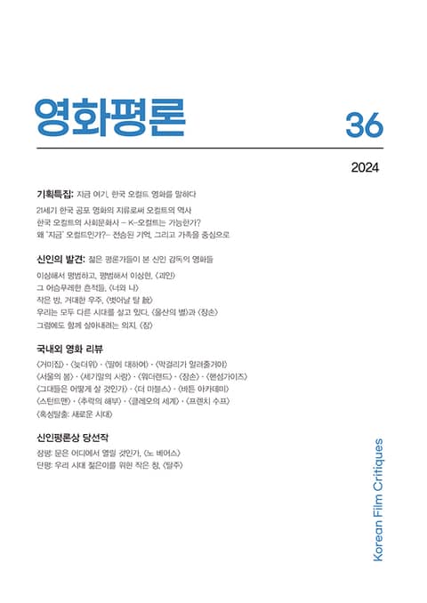 영화리뷰도 영상으로 보는 시대에 글로 영화평론을 한다는 것이 허공에 물을 뿌리는 것만큼 허무한 일처럼 느껴지는 때도 있다. 영화평론을 읽는 사람이 있을까 라는 질문을 해 온지도 10여 년이 된 듯하다. 그럼에도 평론가는 글로 자신을 증명하는 사람이기에 글을 쓰고 책을 만드는 일을 멈출 수는 없다. 허공에 뿌린 물이 공기 중 보이지 않는 수분이 되어 언젠가는 우리 숨결에 스며들듯이, 영화평론 36호가 어딘가에서 누군가에게는, 또 오랜 시간이 지난 후에도 의미 있는 읽을거리가 되어 우리 영화와 함께 살아있기를 바란다.