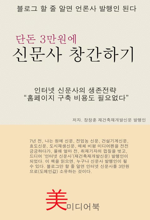 저자인 장창훈은 ‘언론의 양심’의 블로그를 3년간 운영해오다가, 최근에 재건축재개발신문(인터넷 신문사)를 창간했다. 실제 경험했던 이야기들을 수필식으로 재밌게 풀어놓았기 때문에 흥미진진하다. 정말로 3만원만 있으면 인터넷 신문사 발행인이 될 수 있다. 3만원은 도메인 값이다. 저자는 말한다. 창간은 쉽다. 그러나 유지가 어렵다.