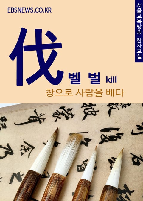 해당 도서는 서울교육방송 한자교실이다. 벨 벌(伐)은 사람 인(人)과 창 과(戈)로 되어있다. 사람이 창을 들고서 사람을 벤다는 뜻이다. 정확히 말하면, 창 과(戈)의 낫 끝에 사람의 목젖이 겨눠있으니, 사람 인(亻)은 사형수를 말한다. 伐(칠 벌)에서 ‘친다’는 말은 칼로 벤다는 뜻이다. 장수가 칼을 휘두르는 것도 ‘친다’이고, 망나니가 사람의 목을 베는 것도 ‘친다’이고 농부가 풀의 목을 베는 것도 치는 것이다. 부엌에서 오이를 써는 것도 ‘치다’이다. 정벌(征伐)은 ‘치고 또 치는’ 것이다. 伐은 정말로 섬뜩한 글자이다. 사람(人)이 창(戈)을 들고서 위에서 아래로 내려치고 있는 모습이다.
