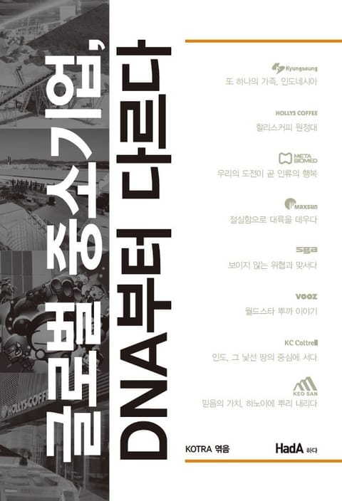 도서출판 하다의 신간 『글로벌 중소기업, DNA부터 다르다』는 이렇게 쌓인 수많은 사례 중 성공으로 향할 수 있는 열정과 굳건한 자신감을 전달할 8개 업체의 이야기를 정리해 내놓았다. 그들의 이야기를 읽어 내려가다 보면 각기 다른 업종과 환경에서 겪은 그들만의 도전과 좌절, 그리고 성공의 이유를 찾을 수 있을 것이다. 또한 배경국가로의 시장 진출에 대한 대략적인 팁도 함께 실음으로써 보다 풍부하고 생생한 정보를 접할 수 있을 것이다.