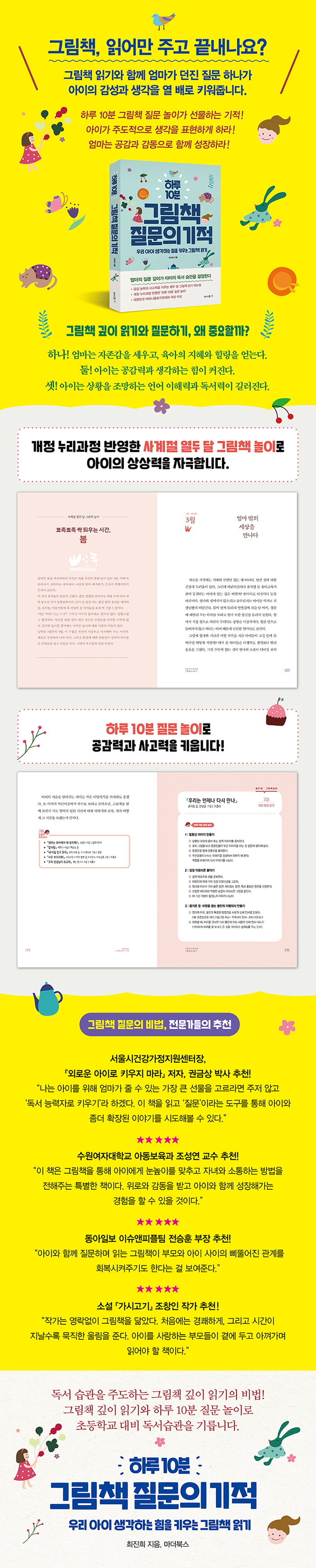 저자는 이 책 『하루 10분 그림책 질문의 기적』에서 ‘하루 10분 질문 놀이’라는 이름으로 아이와 함께 그림책을 보고 집에서 할 수 있는 질문 놀이를 제안한다. 하루에 10분만이라도 시간을 내어 아이와 그림책을 읽고 이야기 나누는 시간을 가져보자. 이 책에 제시된 질문 놀이로 유아 시절부터 그림책과 친해지는 습관을 쌓다보면 어느새 아이가 성장했을 때 맥락을 읽는 ‘깊이 읽기’, 진정한 독서력의 기초를 다질 수 있을 것이다.
