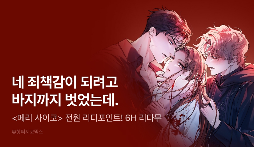- -EVENT 4) 이벤트 기간 동안 <메리 사이코> 완전판/개정판을 각각 프롤로그~5화까지 무료 및 6시간마다 기다리면 무료로 감상하실 수 있습니다.