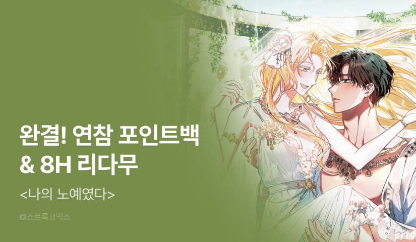 - -EVENT 1) 웹툰 <나의 노예였다> 연참 회차(60화 or 61화)를 유료(대여/소장)로 1화 이상 감상하거나 결제내역에서 구매 확정하신 모든 분들께 1인 1회에 한해 즉시 포인트를 드립니다.