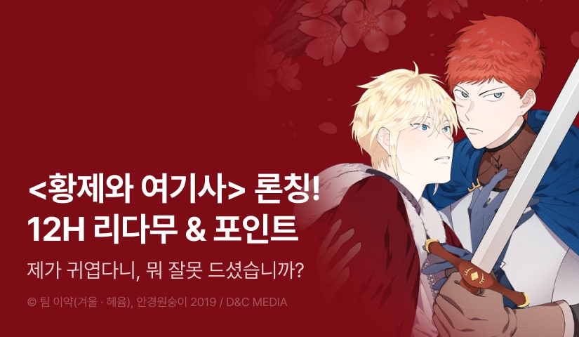 - -EVENT 3) 이벤트 기간 동안 <황제와 여기사>를 1~8화 무료&12시간마다 기다리면 무료로 감상하실 수 있습니다.