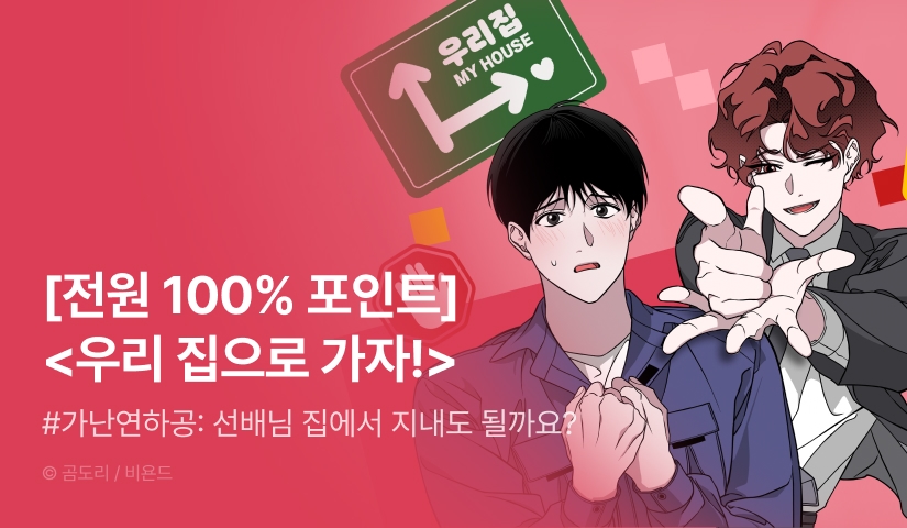- ①이벤트 기간 동안 <우리 집으로 가자!> 웹툰을 1화 이상 유료로 소장 (단, 프롤로그 회차 제외)