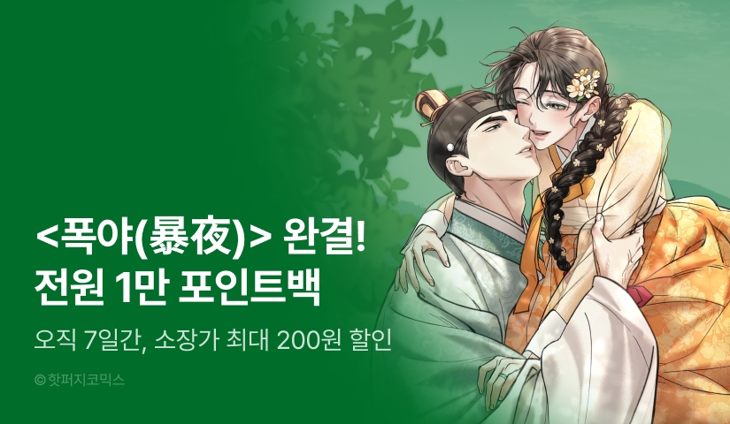 • -EVENT 2) 웹툰 <폭야(완전판/개정판)> 마지막 화를 유료(대여/소장)로 감상하거나 결제내역에서 구매 확정하신 모든 분들께 1인 1회에 한해 즉시 포인트를 드립니다.